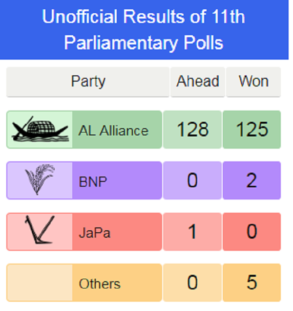 Hasina raced into a clear lead, quickly securing 115 seats against 2 for the opposition, and ahead of 128 seats, according to Prothomalo, which is compiling results from around the country. Sheikh Hasina herself won all the centres. Masrafe bin Mortaza and Zunaid Ahmed Palak and all heavy weight candidates are ahead in the election.